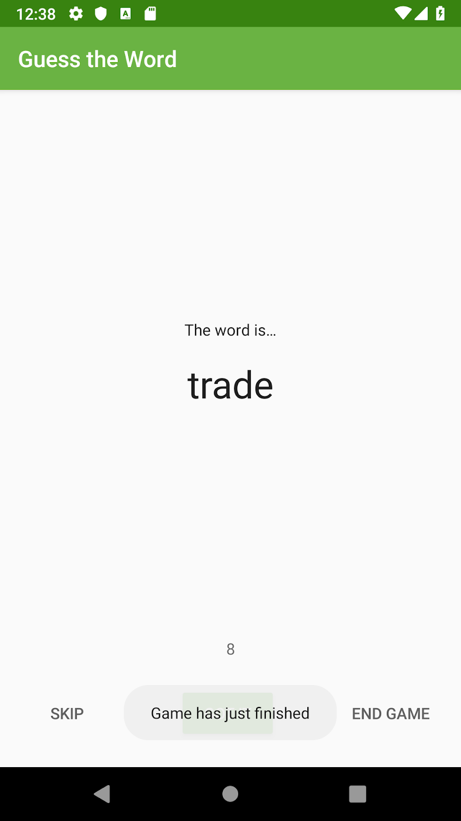 Neste codelab, você vai melhorar o app GuessTheWord adicionando um evento para encerrar o jogo quando o usuário passar por todas as palavras no app. Você também vai adicionar um botão Jogar novamente no fragmento de pontuação para que o usuário possa jogar de novo.