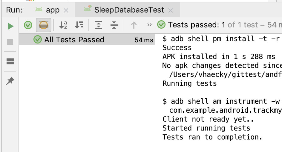 - Depois que os testes forem executados, verifique no painel SleepDatabaseTest se todos foram aprovados.