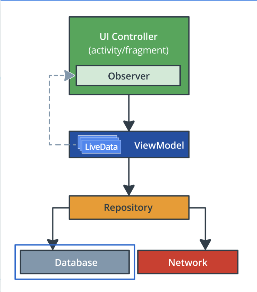 下图展示了 Room 数据库如何融入本课程中推荐的总体架构。