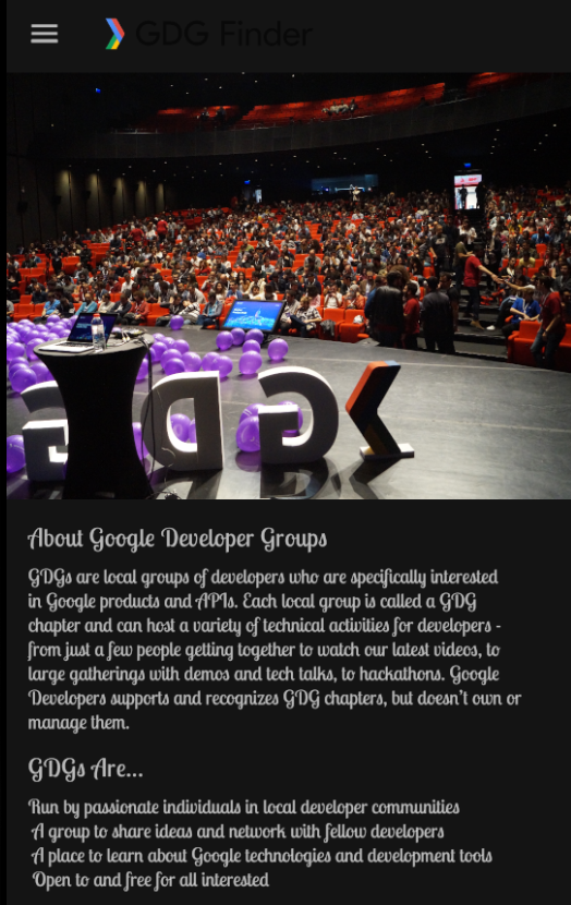 Aplikasi awal pencari GDG dibangun berdasarkan semua yang telah Anda pelajari sejauh ini dalam kursus ini.