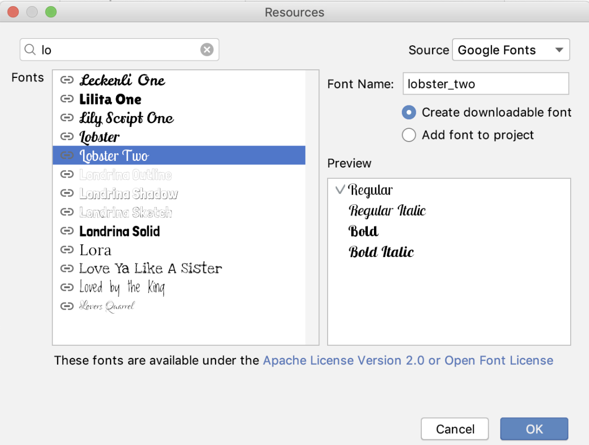 fontFamily. - Pada dialog Resources, temukan font, lalu pilih tombol pilihan Create downloadable font.