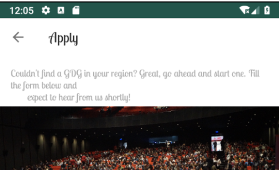 Layar ketiga adalah pencari GDG. GDG, atau Google Developer Group, adalah komunitas developer yang berfokus pada teknologi Google, termasuk Android. GDG di seluruh dunia menyelenggarakan pertemuan, konferensi, study jam, dan acara lainnya.