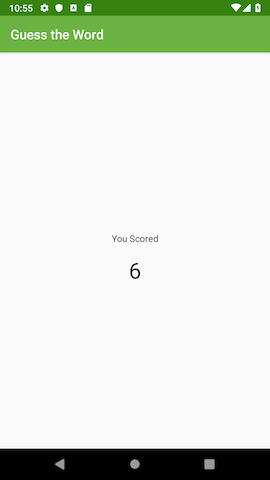 binding.scoreText.text = viewModel.score.toString()- Chạy ứng dụng và chơi trò chơi. Lần lượt xem một số hoặc tất cả các từ rồi nhấn vào Kết thúc trò chơi. Xin lưu ý rằng phân đoạn điểm số hiện hiển thị điểm số chung cuộc.