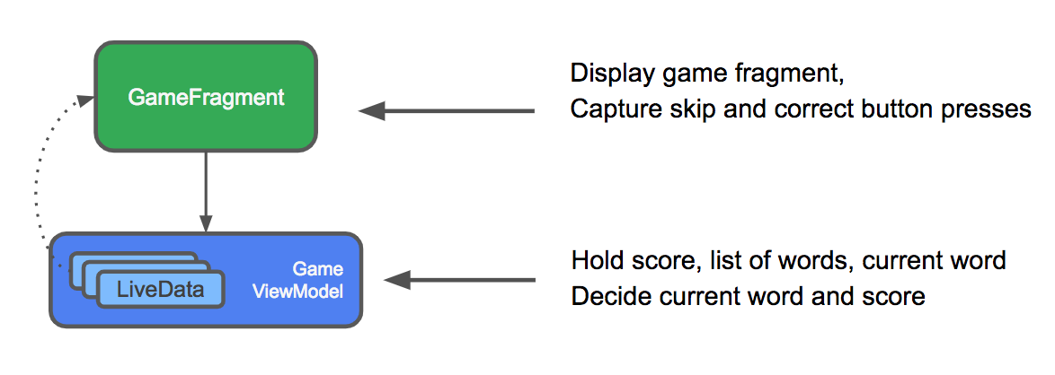 Trong mã khởi động GuessTheWord, các đơn vị điều khiển giao diện người dùng là 3 mảnh: GameFragment, ScoreFragment, và TitleFragment. Theo nguyên tắc thiết kế "phân tách các mối quan tâm", GameFragment chỉ chịu trách nhiệm vẽ các phần tử trò chơi lên màn hình và biết thời điểm người dùng nhấn vào các nút, chứ không làm gì khác. Khi người dùng nhấn vào một nút, thông tin này sẽ được truyền đến GameViewModel.
