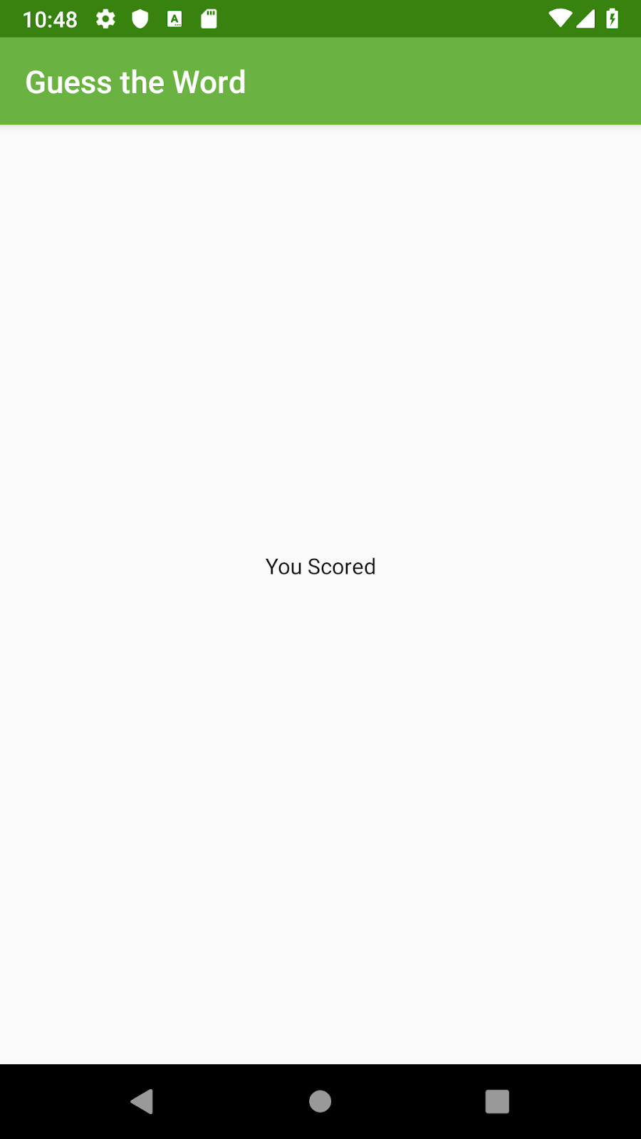}- Chạy ứng dụng, chơi trò chơi và chuyển đổi qua một số từ. Nhấn vào nút Kết thúc trò chơi . Lưu ý rằng ứng dụng sẽ chuyển đến màn hình điểm số, nhưng điểm số cuối cùng không xuất hiện. Bạn sẽ khắc phục vấn đề này trong nhiệm vụ tiếp theo.