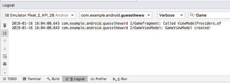2019-02-07 10:50:18.328 com.example.android.guesstheword I/ScoreViewModel: Final score is 15