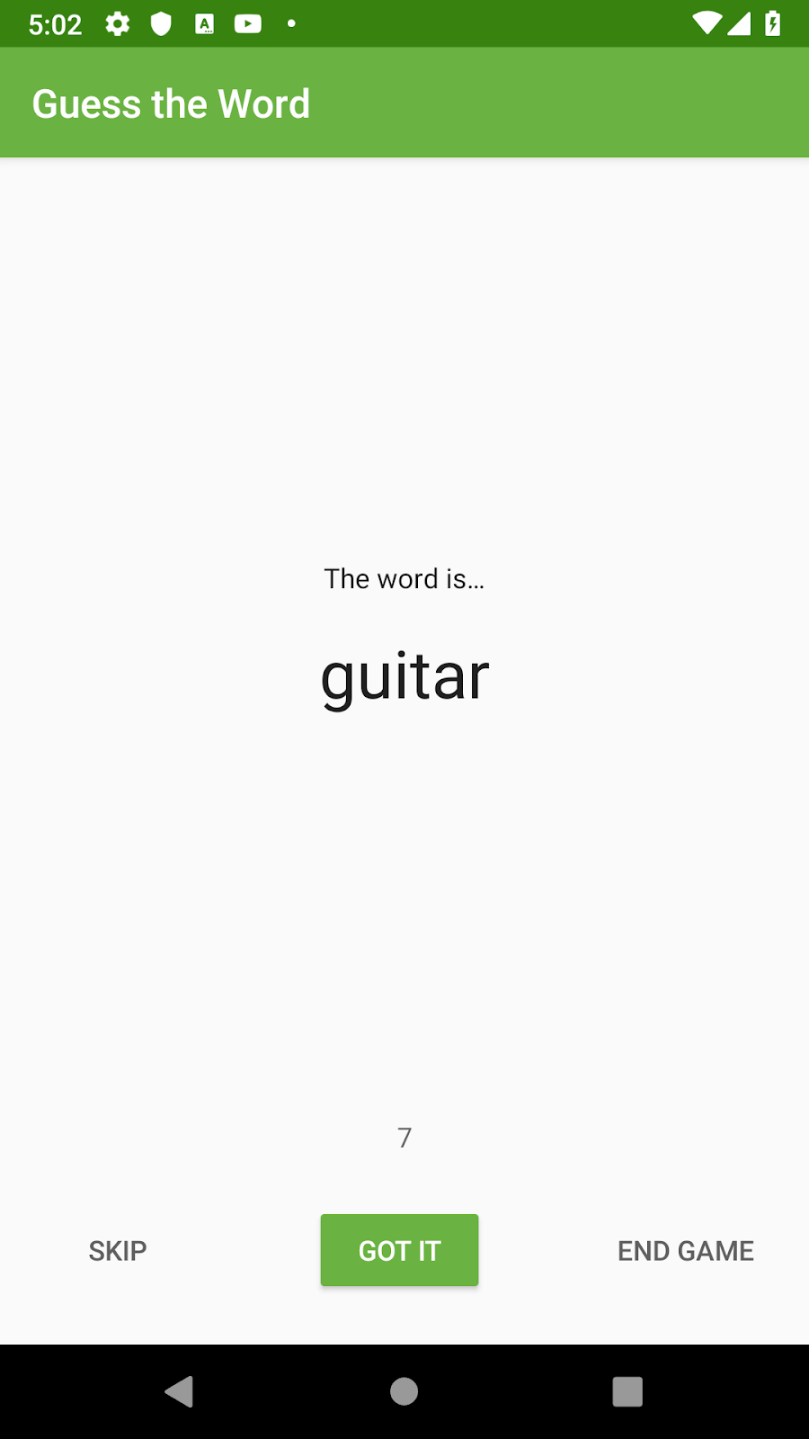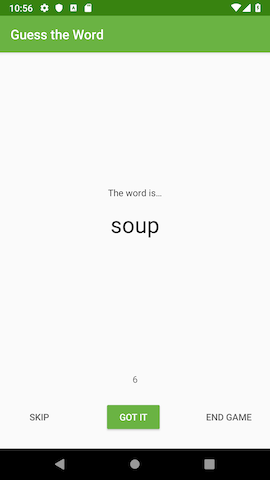 - Nhấn vào các nút. Lưu ý rằng nút Skip (Bỏ qua) sẽ chuyển sang từ tiếp theo và giảm điểm đi 1, còn nút Got It (Tôi hiểu) sẽ chuyển sang từ tiếp theo và tăng điểm thêm 1. Nút End Game (Kết thúc trò chơi) chưa được triển khai, nên sẽ không có gì xảy ra khi bạn nhấn vào nút này.