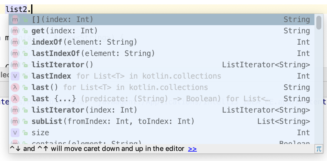 - Ada banyak hal yang dapat Anda lakukan dengan daftar. Salah satu cara untuk melihat fungsi yang tersedia adalah dengan membuat daftar di IntelliJ IDEA, menambahkan titik, lalu melihat daftar pelengkapan otomatis di tooltip. Ini berfungsi untuk objek apa pun. Cobalah dengan daftar.
