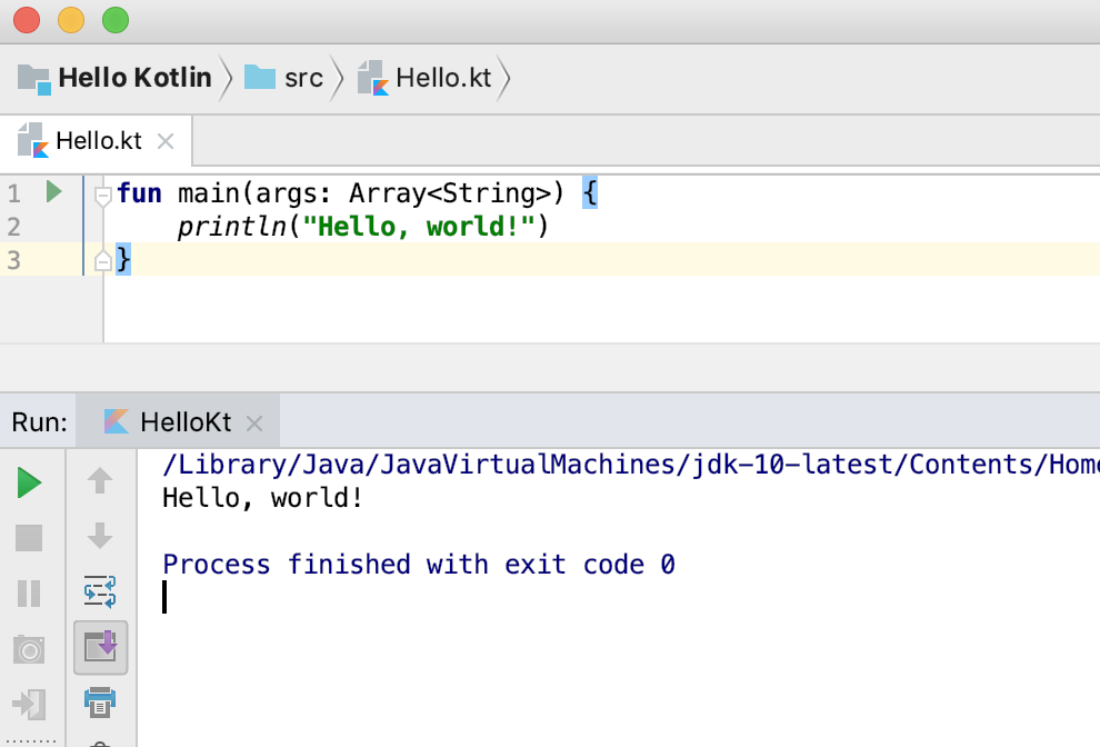 main()işlevinin solundaki yeşil üçgeni tıklayın. Menüden Run 'HelloKt' (HelloKt'yi Çalıştır) seçeneğini belirleyin. - IntelliJ IDEA, programı derleyip çalıştırır. Sonuçlar, aşağıda gösterildiği gibi alt kısımdaki bir günlük bölmesinde görünür.