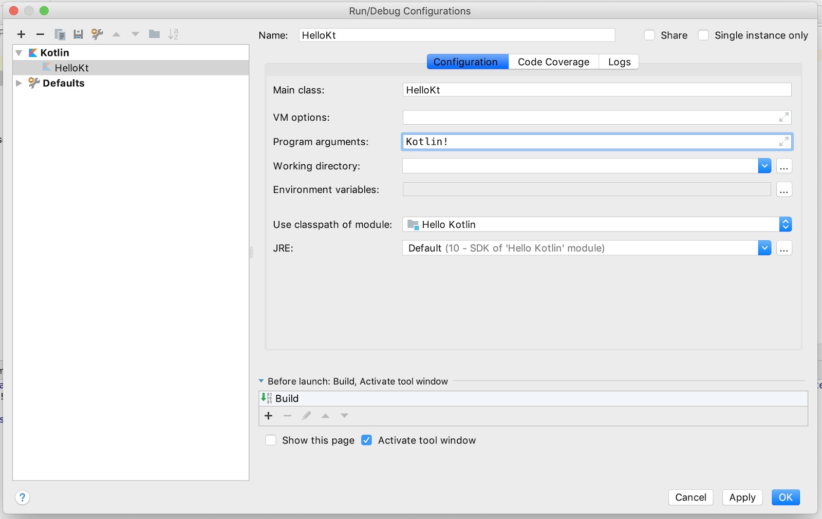 Kotlin!vào trường Program arguments (Đối số chương trình). - Nhấp vào OK.
