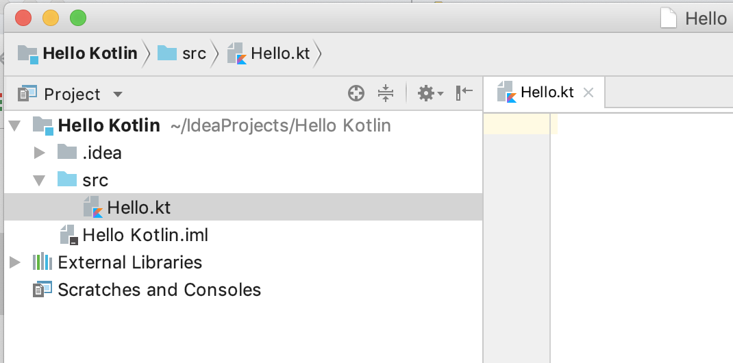 Hiện có một tệp trong thư mục src có tên là Hello.kt.