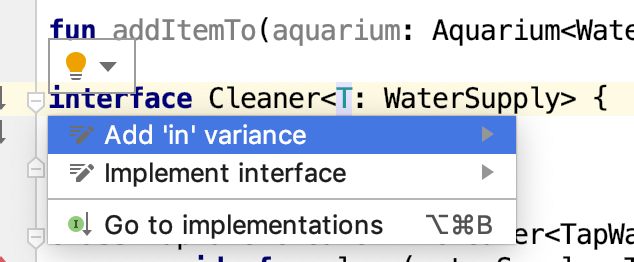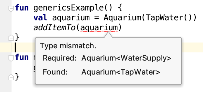 }Aquariumnesnesini oluştururken Kotlin'de tür çıkarımı olduğundan köşeli parantezleri ve aralarındaki içeriği kaldırabilirsiniz. Bu nedenle, örneği oluştururkenTapWaterifadesini iki kez kullanmanıza gerek yoktur. Tür,Aquariumbağımsız değişkeninden çıkarılabilir. Bu durumda, türüTapWaterolan birAquariumoluşturulur.