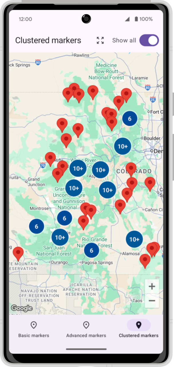 Podobnie jak w przypadku innych typów znaczników, zgrupowane znaczniki można dostosowywać. Parametr clusterItemContent w funkcji kompozycyjnej Clustering ustawia niestandardowy blok kompozycyjny do renderowania elementu nieklastrowanego. Zaimplementuj funkcję @Composable, aby utworzyć znacznik. Funkcja SingleMountain renderuje komponent Material 3 Icon z dostosowanym schematem kolorów tła.
