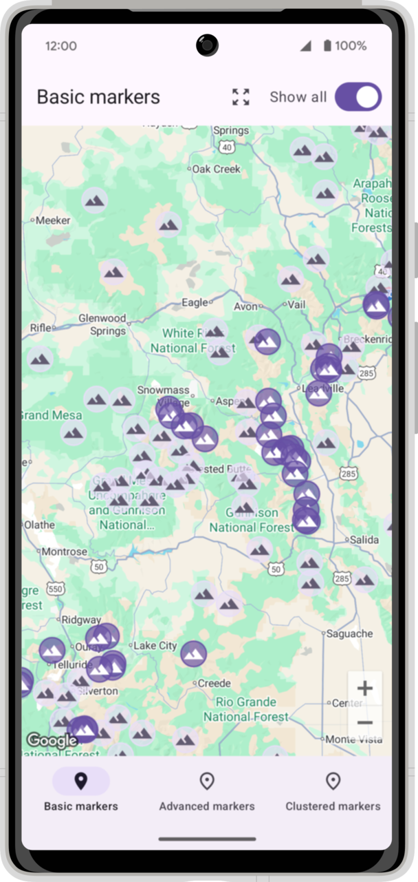 Giống như các loại điểm đánh dấu khác, bạn có thể tuỳ chỉnh điểm đánh dấu theo cụm. Tham số clusterItemContent của thành phần kết hợp Clustering sẽ đặt một khối thành phần kết hợp tuỳ chỉnh để kết xuất một mục không được phân cụm. Triển khai hàm @Composable để tạo điểm đánh dấu. Hàm SingleMountain kết xuất một Icon có khả năng kết hợp Material 3 với bảng phối màu nền tuỳ chỉnh.