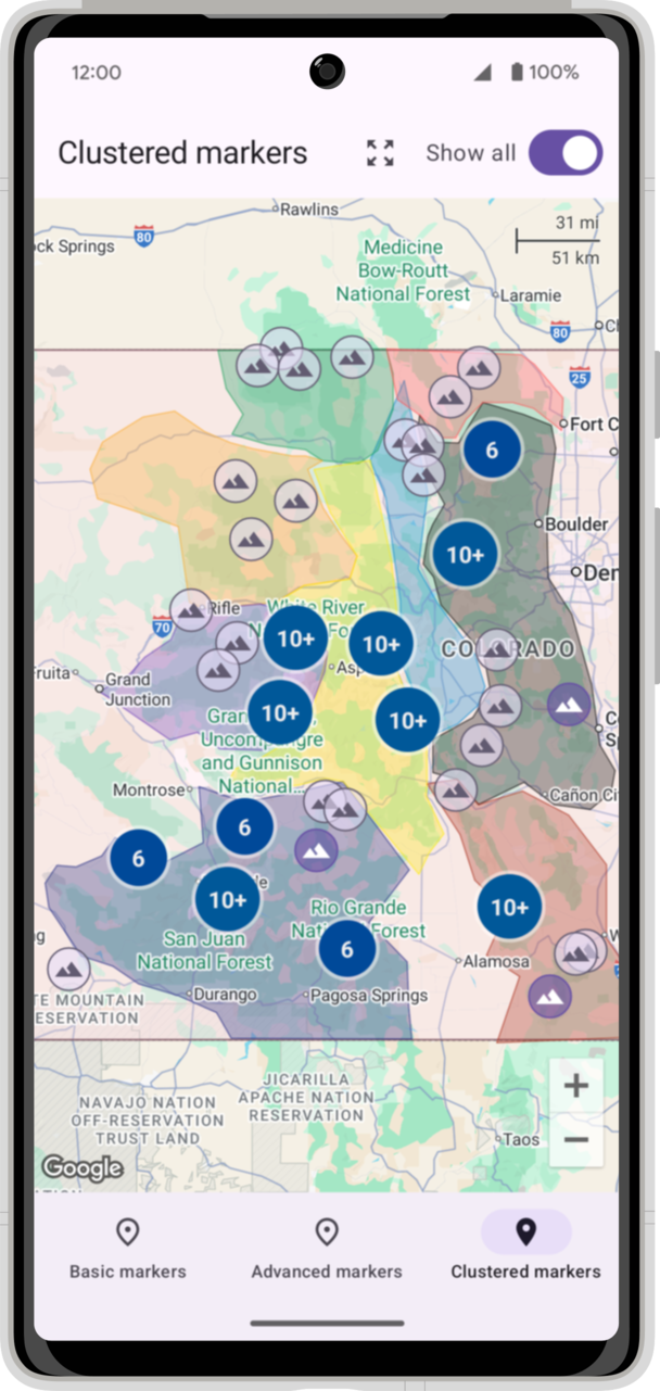 Podobnie jak w przypadku innych typów znaczników, zgrupowane znaczniki można dostosowywać. Parametr clusterItemContent w funkcji kompozycyjnej Clustering ustawia niestandardowy blok kompozycyjny do renderowania elementu nieklastrowanego. Zaimplementuj funkcję @Composable, aby utworzyć znacznik. Funkcja SingleMountain renderuje komponent Material 3 Icon z dostosowanym schematem kolorów tła.