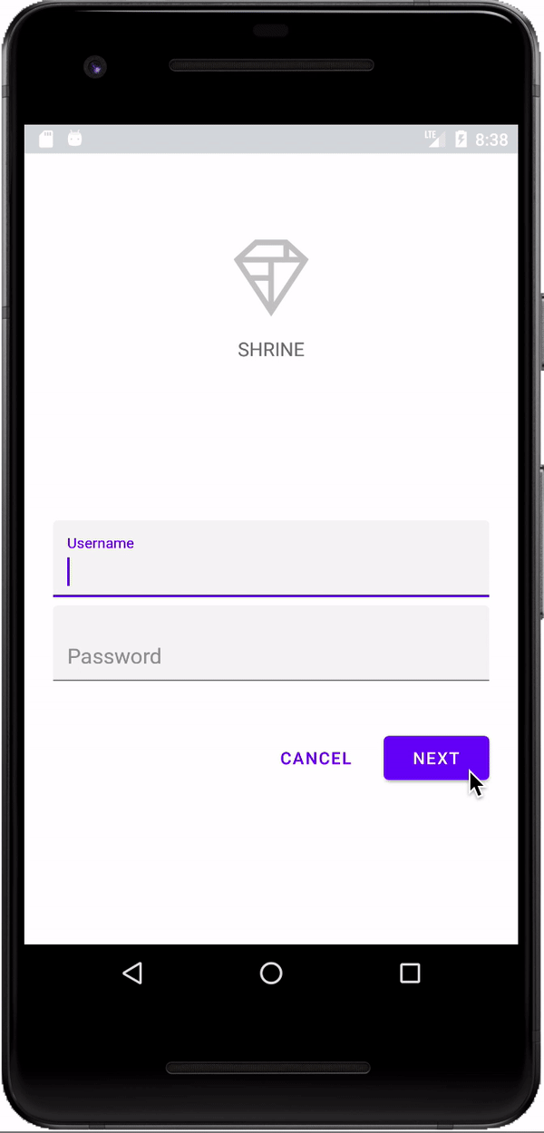 Berhasil! Kode awal untuk halaman login Shrine akan berjalan di emulator Anda. Anda akan melihat nama "Shrine" dan logo Shrine tepat di bawahnya.