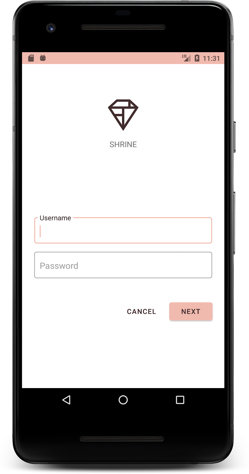 Operazione riuscita. Dovresti visualizzare la pagina di accesso di Shrine in esecuzione sul tuo dispositivo o emulatore. Quando premi Avanti, viene visualizzata la home page di Shrine con una barra delle app nella parte superiore e una griglia di immagini dei prodotti sotto.