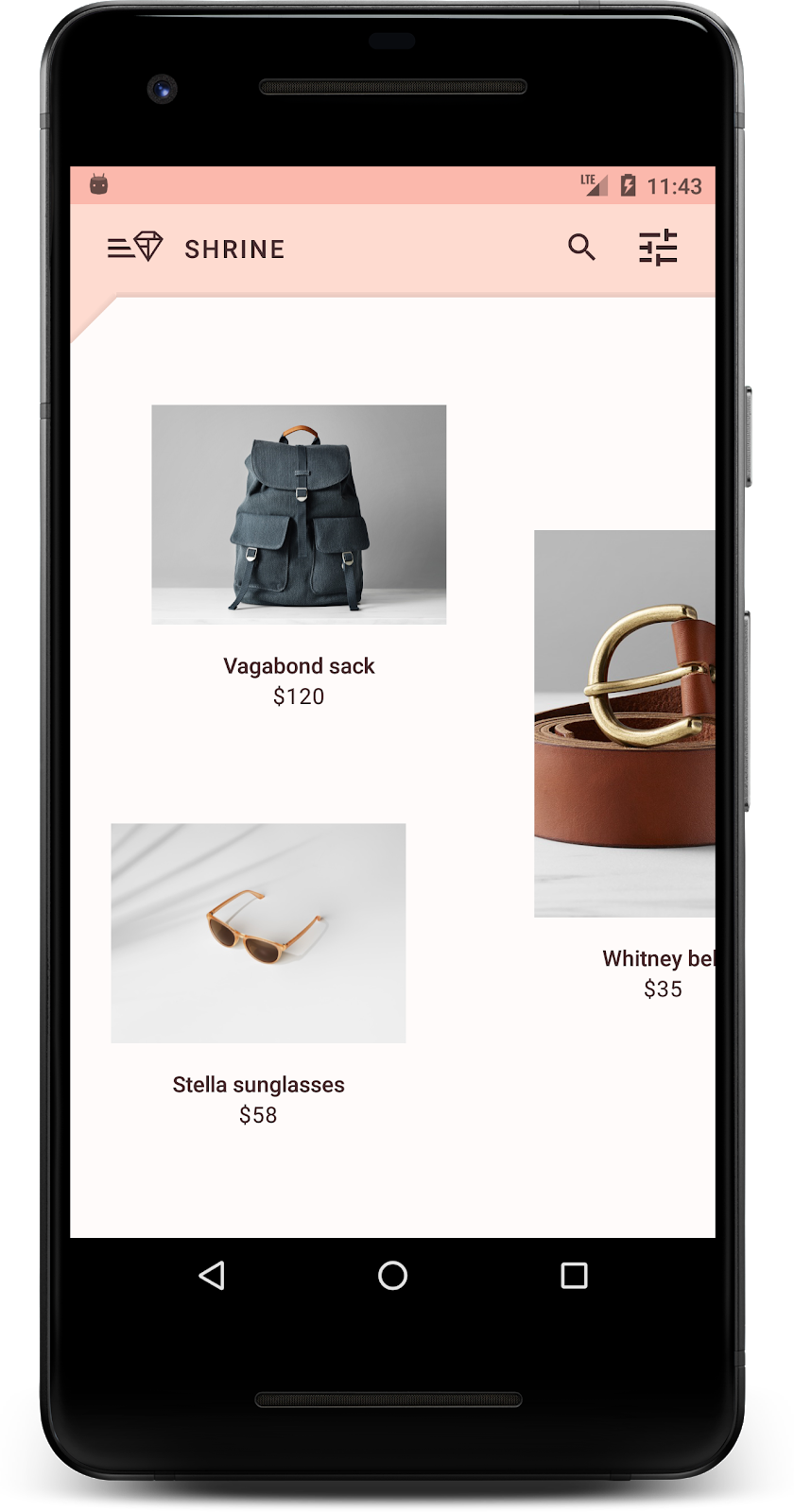 Codelab MDC-101 および MDC-102 では、マテリアル コンポーネント(MDC)を使用して、Shrine というアプリの土台を構築しました。Shrine は、衣服と生活雑貨を販売する e コマースアプリです。このアプリのユーザーフローは、最初にログイン画面を表示し、次に商品を表示するホーム画面に移動します。