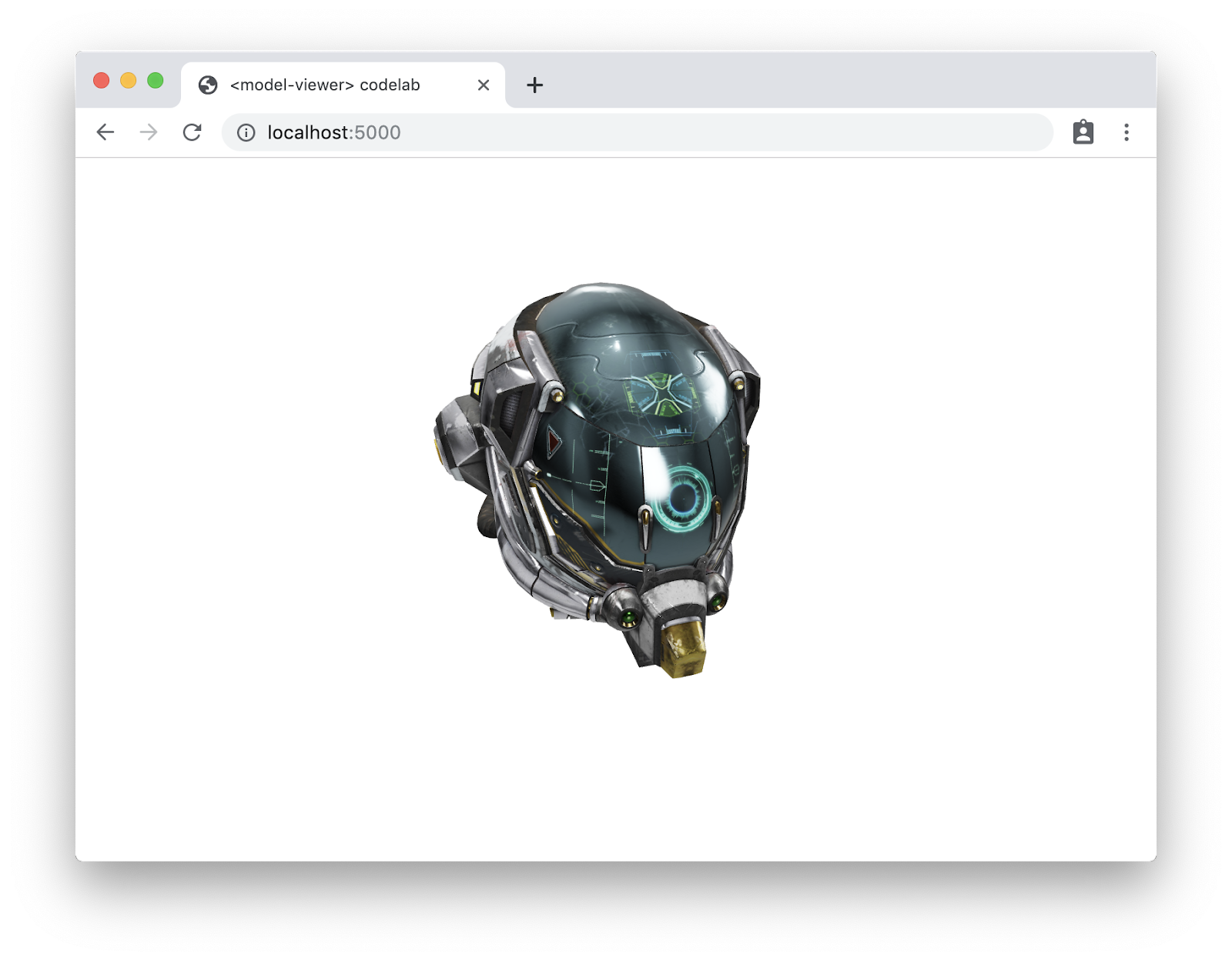 Niektóre z tych zmian (zwłaszcza zmiany oświetlenia) będą najlepiej widoczne w przypadku określonych modeli. Najpierw zaktualizuj atrybut src, aby wskazywał nowy model: third_party/DamagedHelmet/DamagedHelmet.gltf (udostępniony na licencji Creative Commons Uznanie autorstwa – Bez użycia komercyjnego na platformie Sketchfab). Źródło całego elementu powinno teraz wyglądać tak: