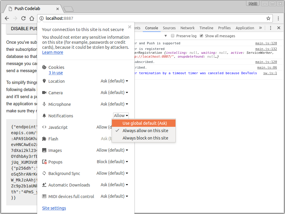फ़िलहाल, वेब ऐप्लिकेशन में चालू करें बटन बंद है और इस पर क्लिक नहीं किया जा सकता. ऐसा इसलिए, क्योंकि पुश बटन को डिफ़ॉल्ट रूप से बंद रखना एक अच्छा तरीका है. इसे तब चालू करें, जब आपको पता हो कि ब्राउज़र पर पुश मैसेजिंग की सुविधा काम करती है. साथ ही, आपको यह पता हो कि उपयोगकर्ता ने मैसेज पाने के लिए सदस्यता ली है या नहीं.