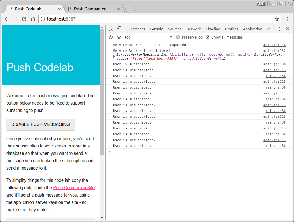 現時点では、[Enable Push Messaging] ボタンはあまり機能しません。これを修正しましょう。