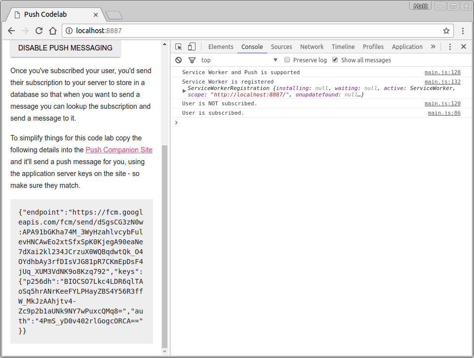 権限を付与すると、User is subscribed がコンソールに記録されます。ボタンのテキストが [Disable Push Messaging] に変わり、ページの最下部にサブスクリプションが JSON データとして表示されます。