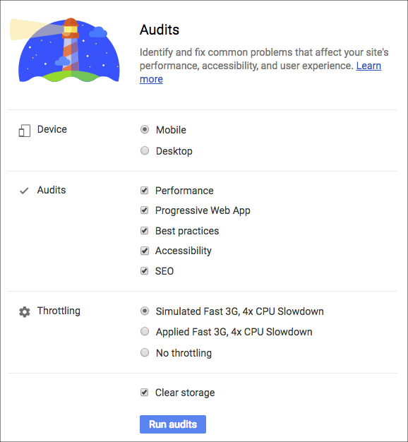 ارجع إلى التطبيق (في Chrome) وافتح علامة التبويب عمليات التدقيق في أدوات المطوّرين. من المفترض أن يظهر لك رمز Lighthouse وخيارات الإعداد. اختَر "الجهاز الجوّال" في الجهاز، واختَر جميع عمليات التدقيق، واختَر أحد خيارات التقييد، ثم اختَر محو مساحة التخزين: