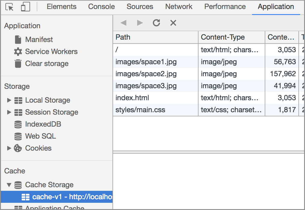 वैकल्पिक: कैश मेमोरी स्टोरेज सेक्शन को बड़ा करके, डेवलपर टूल के ऐप्लिकेशन टैब में भी कैश मेमोरी में सेव किए गए संसाधन देखे जा सकते हैं:
