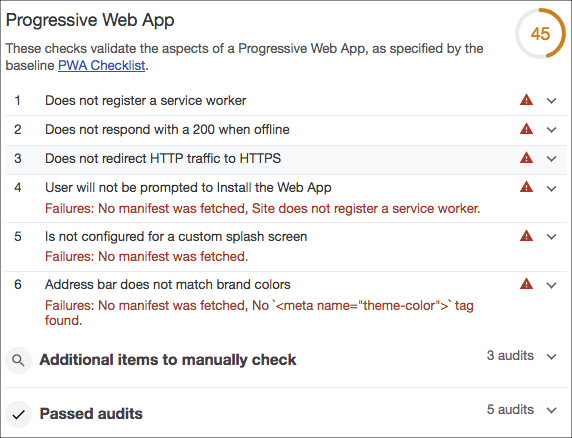 Skor PWA kita masih belum bagus. Beberapa kegagalan yang tersisa yang tercantum dalam laporan adalah pengguna tidak akan diminta untuk menginstal aplikasi web kami, dan kami belum mengonfigurasi layar pembuka atau warna merek di kolom URL. Kita dapat memperbaiki masalah ini dan menerapkan Tambahkan ke Layar Utama secara progresif dengan memenuhi beberapa kriteria tambahan. Yang terpenting, kita perlu membuat file manifes.