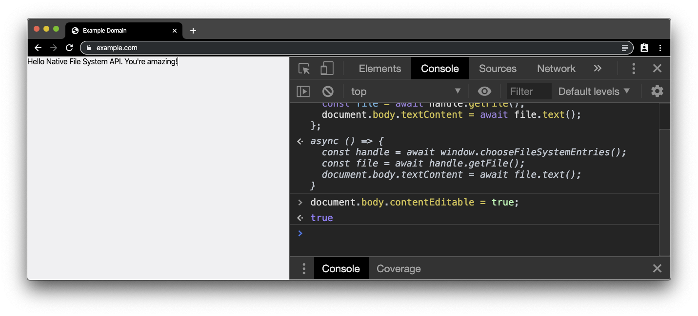 Bonjour, Créez un fichier .txt simple, puis saisissez du texte. Ensuite, accédez à un site sécurisé (c'est-à-dire un site diffusé via HTTPS) comme example.com, puis ouvrez la console d'outils pour les développeurs. Collez l'extrait de code ci-dessous dans la console. Étant donné que l'API Native File System nécessite un geste utilisateur, nous allons joindre un gestionnaire de double clic sur le document. Vous aurez besoin du gestionnaire de fichiers plus tard. Nous allons donc en faire une variable globale.