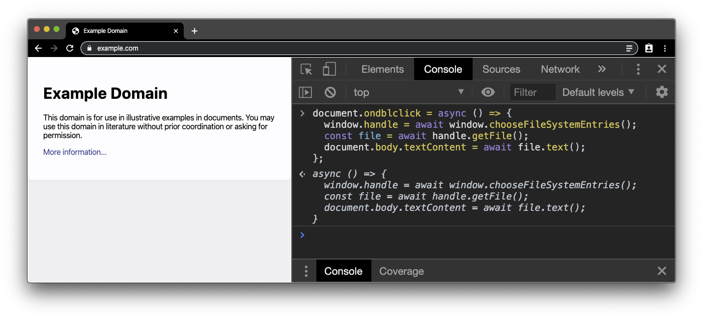 The "Hello, world" dari Native File System API adalah membaca file lokal dan mendapatkan konten file. Buat file .txt biasa dan masukkan beberapa teks. Berikutnya, buka situs aman (yaitu, situs yang ditayangkan melalui HTTPS) seperti example.com dan buka konsol DevTools. Tempel cuplikan kode di bawah ini di konsol. Karena Native File System API memerlukan gestur pengguna, kami melampirkan pengendali klik dua kali pada dokumen. Kita akan memerlukan handle file di lain waktu, jadi kita cukup menjadikannya variabel global.