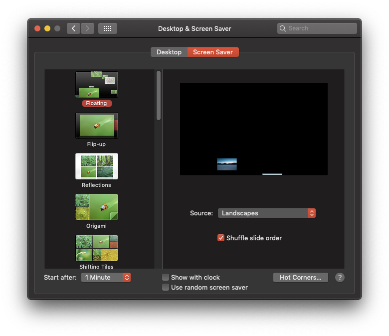 Aby przetestować interfejs API Wake Lock, musisz najpierw upewnić się, że urządzenie uśpie. Dlatego w panelu ustawień Twojego systemu operacyjnego aktywuj wybrany wygaszacz ekranu i upewnij się, że rozpocznie się on po upływie 1 minuty. Upewnij się, że działa, pozostawiając urządzenie bez zmian przez pewien czas (tak, to boli mnie). Zrzuty ekranu poniżej pokazują funkcję macOS, ale możesz ją wypróbować na urządzeniu z Androidem lub na dowolnej obsługiwanej platformie komputerowej.