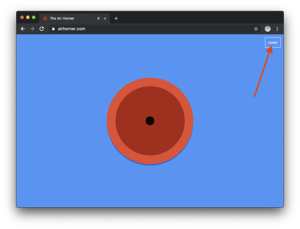 為了讓這個 API 正常運作,您需要安裝在桌面上的 PWA,因此第一步是安裝 PWA,例如著名的 airhorner.com。您可以點選右上角的 [安裝] 按鈕,或使用三點選單手動安裝。