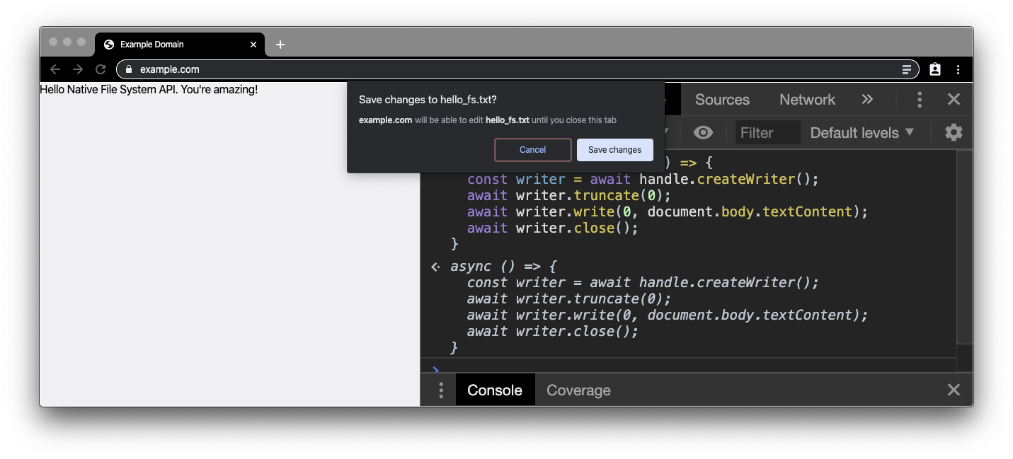 現在,我們要將這些變更寫回原始檔案。因此,我們需要對檔案寫入者的寫入者,方法是在主控台中貼上下方的程式碼片段。再次需要用到使用者手勢,因此我們必須等候主要文件點擊。
