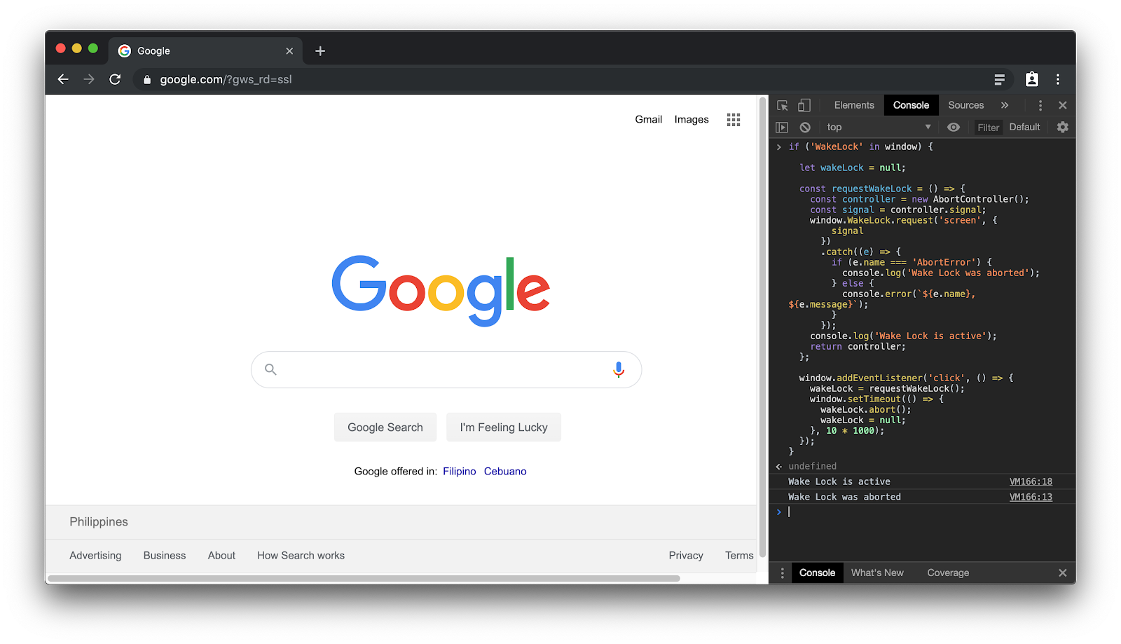 這是什麼功能呢?如要瞭解詳情,請前往 Wake Lock 示範應用程式的 Glitch 專案,並查看 script.js。程式碼的重心放在下方的程式碼片段中。開啟新分頁 (或使用任何已開啟的分頁),並將下列程式碼貼到 Chrome 開發人員工具主控台中。然後,您將在窗口中看到一個 10 秒激活的 Wake Lock 檢查一個 10 秒(查看控制台日誌),您的屏幕銳步器都不起時起。