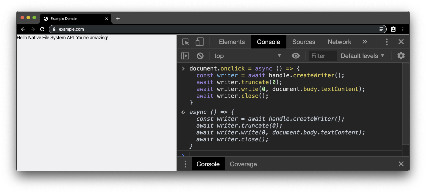 Native File System API 的「Hello, world」是用於讀取本機檔案並取得檔案內容。建立純文字 .txt 檔案並輸入一些文字。接下來,瀏覽至任何安全網站 (例如透過 HTTPS 提供服務的網站),例如 example.com 並開啟 DevTools 主控台。在主控台中貼上下方的程式碼片段。由於 Native File System API 需要使用者手勢,因此我們會在文件中附加 DoubleClick Search 處理常式。稍後我們將處理這個檔案處理,因此將其成為全域變數。