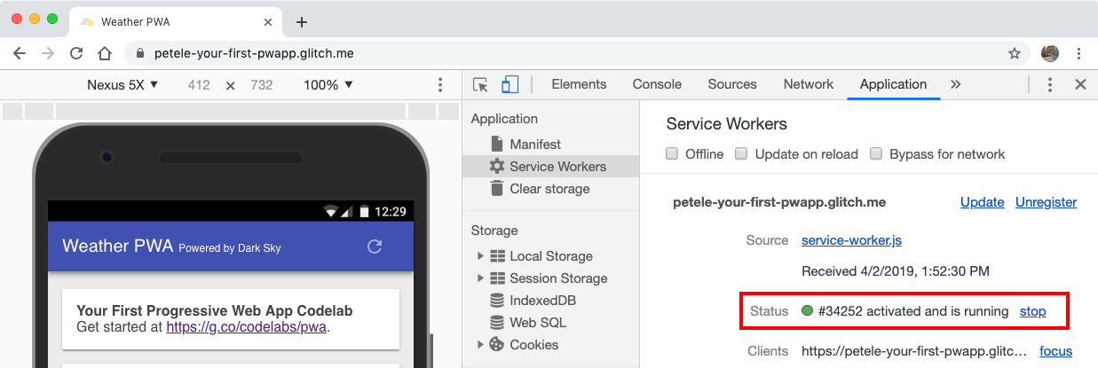 .envوعدِّله باستخدام واجهة برمجة تطبيقات DarkSky. - انقر على الزر عرض ثم اختر في نافذة جديدة للاطلاع على تطبيق الويب التقدّمي (PWA) بشكل عملي.