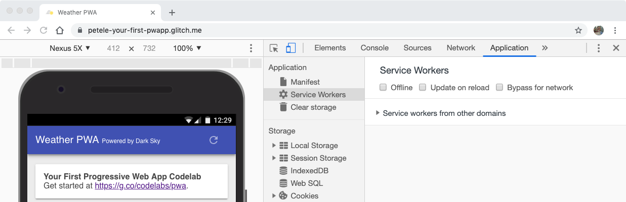 .envi zaktualizuj go za pomocą klucza interfejsu DarkSky API. - Kliknij przycisk Pokaż, a następnie W nowym oknie, by zobaczyć PWA w działaniu.