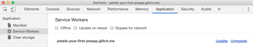 Nie zapomnij zaktualizować elementu CACHE_NAME w pliku service-worker.js, ponieważ wprowadziłeś zmiany w plikach, które są już zapisane w pamięci podręcznej. W trakcie pracy opcji Pomiń dla sieci w panelu Skrypty Service Worker w panelu Application (Narzędzia) w Narzędziach deweloperskich będą działać, ale te rozwiązania nie są przydatne w rzeczywistym środowisku.