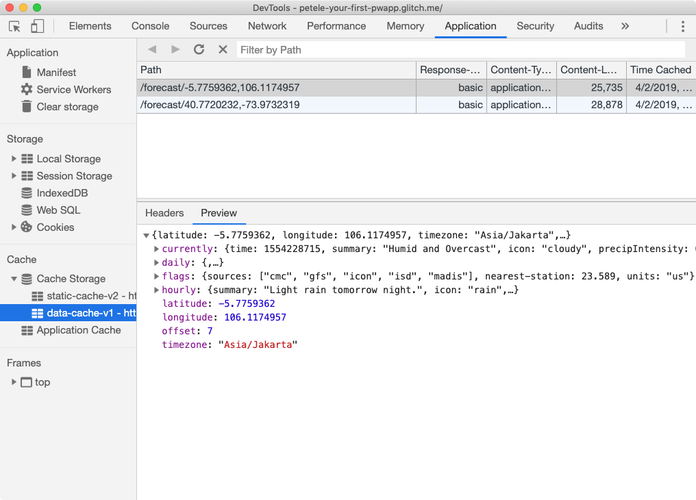 .enve atualize-o com sua chave de API DarkSky. - Clique no botão Show e escolha In a New Window para ver o PWA em ação.