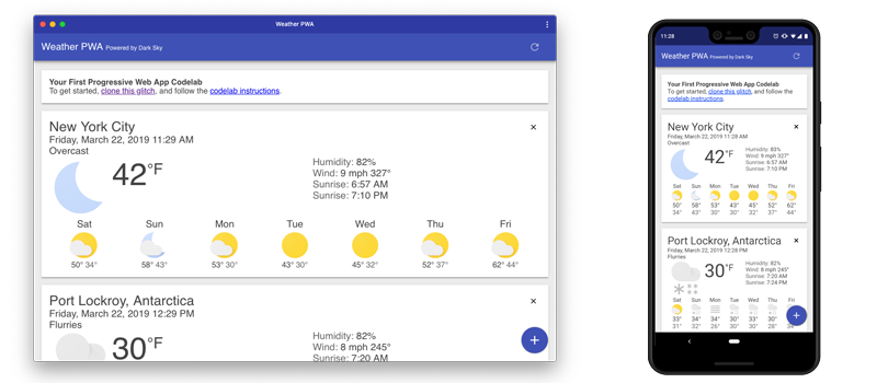 在此 Codelab 中,您将使用 PWA 技术构建天气 Web 应用。您的应用将:
