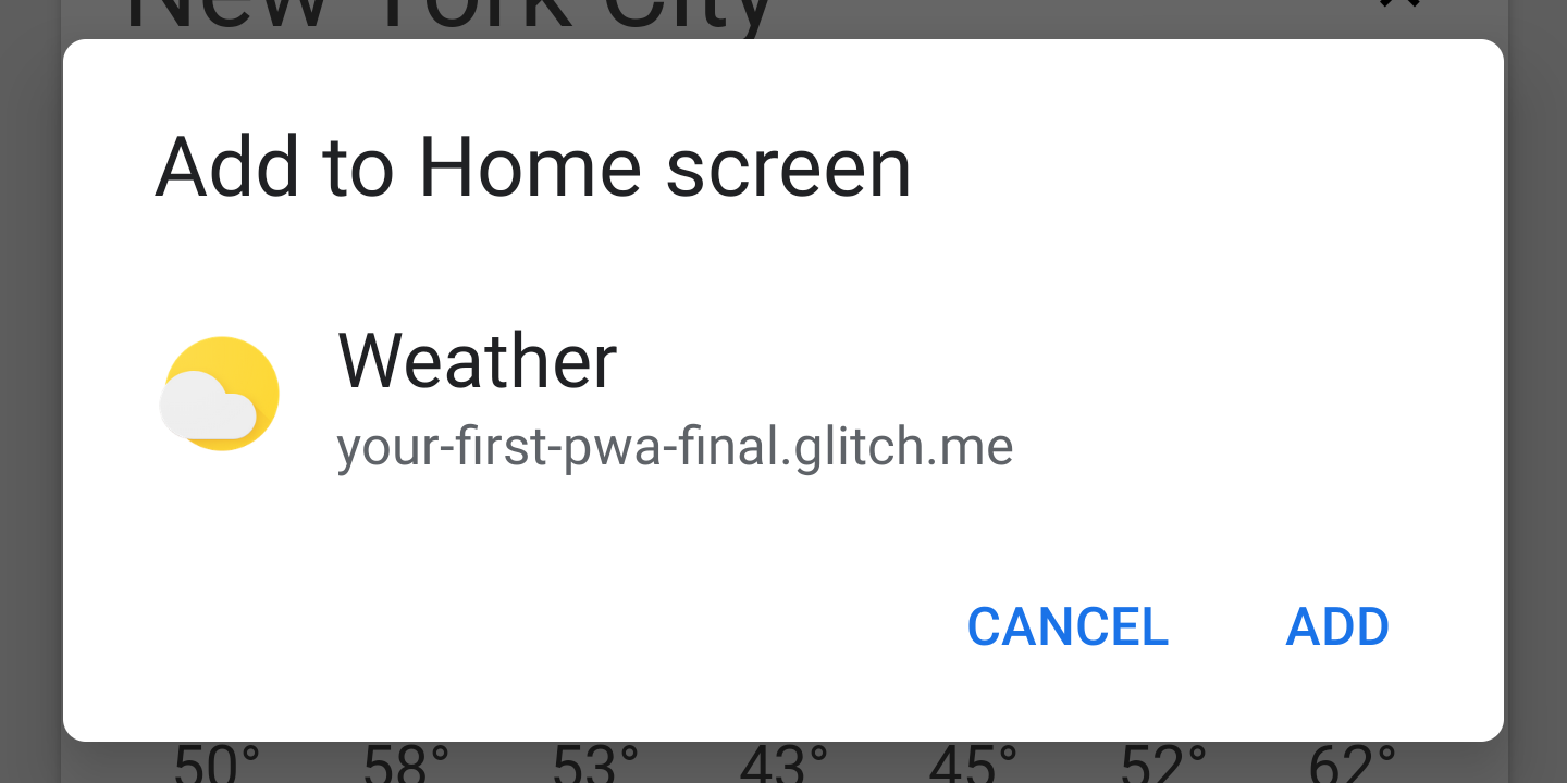 - 打开 Chrome,然后在新的浏览器标签页中导航至 天气 PWA。