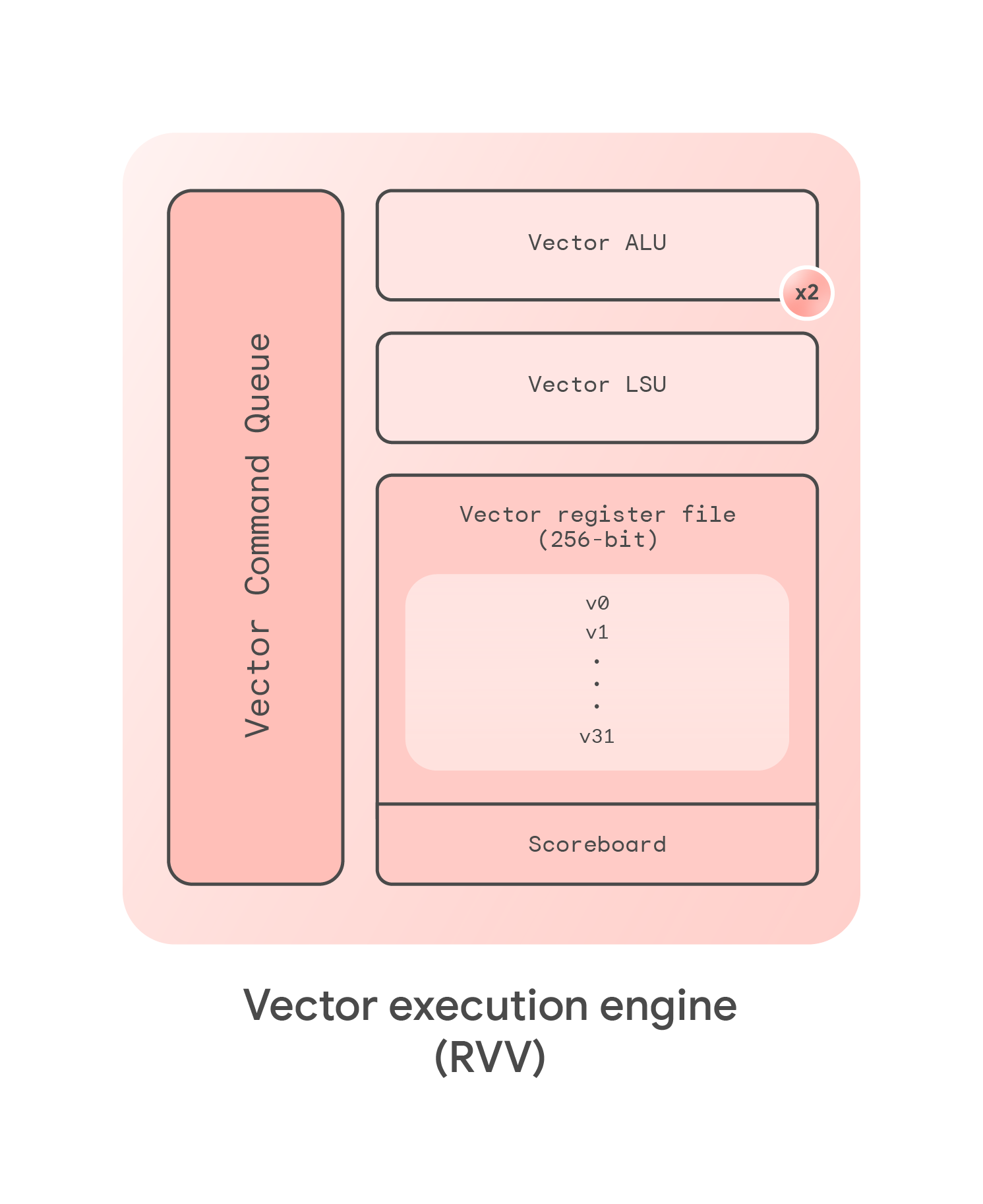 Coral NPU is a RISC-V CPU built for custom single-instruction, multiple data (SIMD) instructions and microarchitectural features that align with the dataplane properties of an ML accelerator. The design of Coral NPU starts with domain and matrix capabilities—vector and scalar capabilities are then added for a fused architecture.