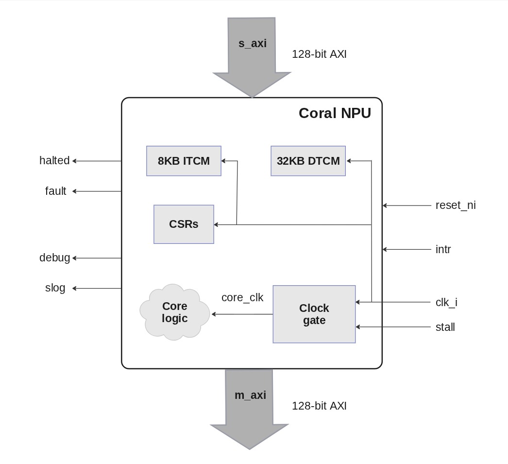 | wfi | Active-high signal from the Coral NPU core, indicating that the core is waiting for an interrupt. While this is active, Coral NPU is clock-gated. |