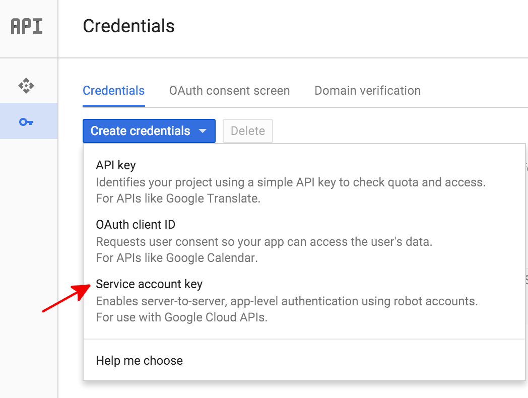 Acesse Credenciais > Criar uma credencial > Chave da conta de serviço. Siga as instruções para criar um serviço padrão.