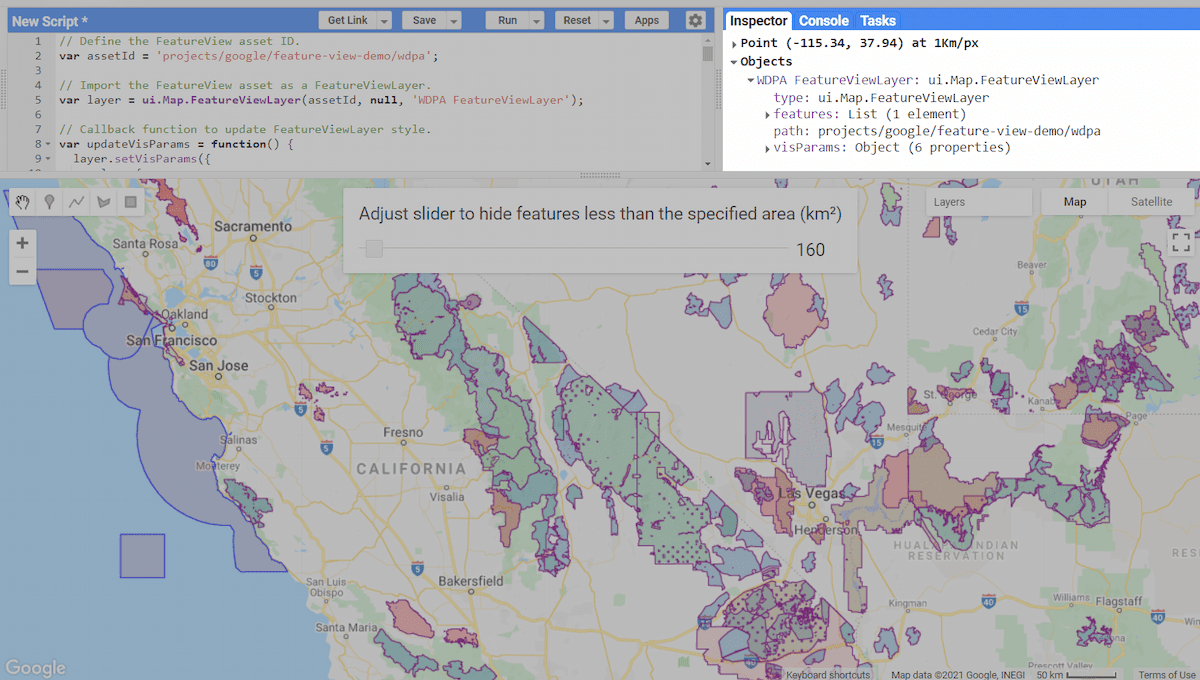 Объекты FeatureView , доступные только для просмотра, не могут быть включены в вычисления или выражения, но их можно визуализировать и проверять в редакторе кода JavaScript и приложениях Earth Engine как FeatureViewLayer . Их также можно интегрировать в приложения Google Maps API.