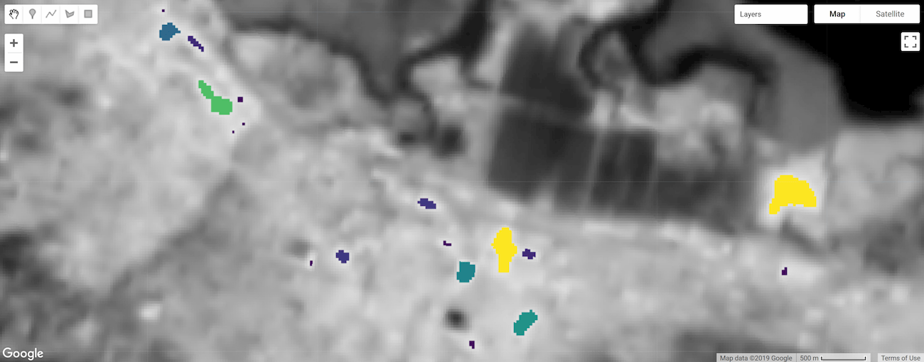 # Uniquely label the hotspot image objects. object_id = hotspots.connectedComponents( connectedness=ee.Kernel.plus(1), maxSize=128 ) # Add the uniquely ID'ed objects to the map. map_objects.add_layer(object_id.randomVisualizer(), None, 'Objects')