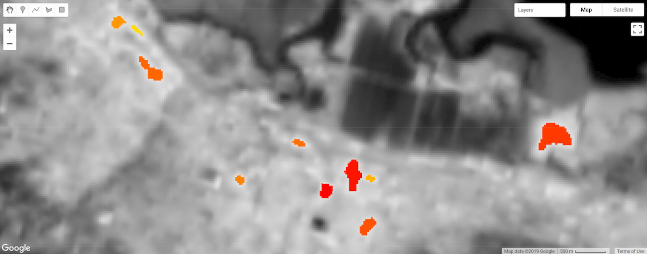 # Threshold the `object_area` image to define a mask that will mask out # objects below a given size (1 hectare in this case). area_mask = object_area.gte(10000) # Update the mask of the `object_id` layer defined previously using the # minimum area mask just defined. object_id = object_id.updateMask(area_mask) map_objects.add_layer(object_id, None, 'Large hotspots')