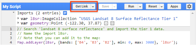 Кодом в редакторе можно поделиться через URL-адрес закодированного снимка, который создается при нажатии кнопки «Получить ссылку» в верхней части редактора кода. Когда URL-адрес посещает кто-то с учетной записью Earth Engine, браузер переходит в редактор кода и копирует среду, которая была на момент создания ссылки, включая код, импорт, слои карты и положение карты. Нажатие кнопки «Получить ссылку» автоматически скопирует ссылку на скрипт в буфер обмена. Кроме того, появится диалоговое окно с опциями для управления выполнением общего скрипта, а также кнопками для копирования и перехода по созданной ссылке. Параметры управления включают в себя предотвращение автоматического запуска сценария и скрытие панели кода, когда кто-то открывает общую ссылку. Перетаскиваемое диалоговое окно можно закрыть с помощью клавиши «Esc» или щелчка в другом месте страницы.