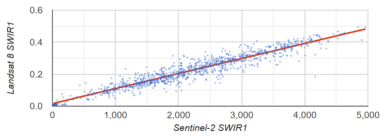 Angenommen, Sie möchten die lineare Beziehung zwischen der Reflexion von Sentinel-2 und Landsat 8 SWIR1 kennen. In diesem Beispiel wird eine zufällige Stichprobe von Pixeln, die als Punkt-Feature-Collection formatiert ist, verwendet, um die Beziehung zu berechnen. Es wird ein Streudiagramm der Pixelpaare mit der besten Anpassungslinie der kleinsten Quadrate generiert (Abbildung 2).